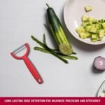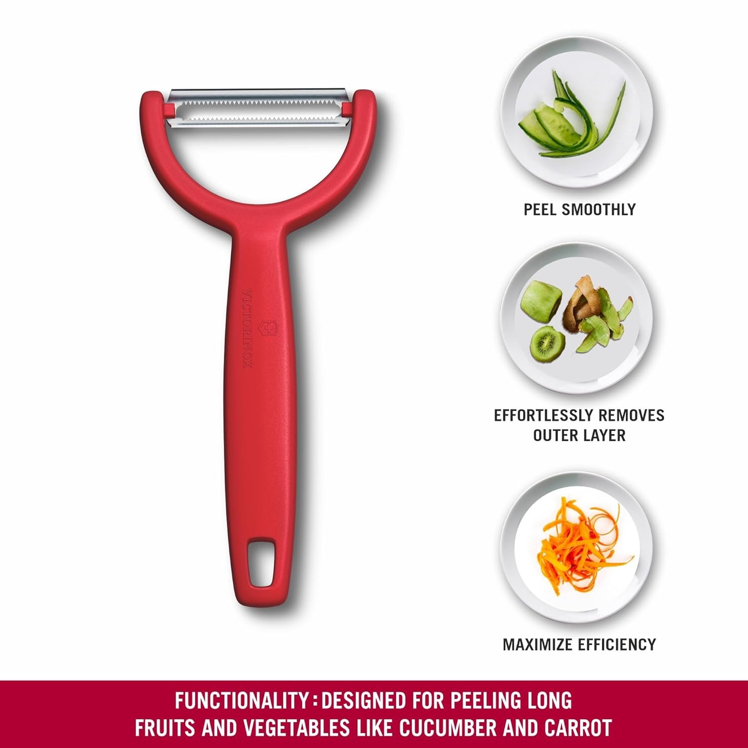 FUNCTIONALITY: Designed for long fruits and vegetables like cucumbers or carrots, it features a specific edge angle that helps with removing only the outer layer, minimizing waste while prioritizing user friendliness and safety.