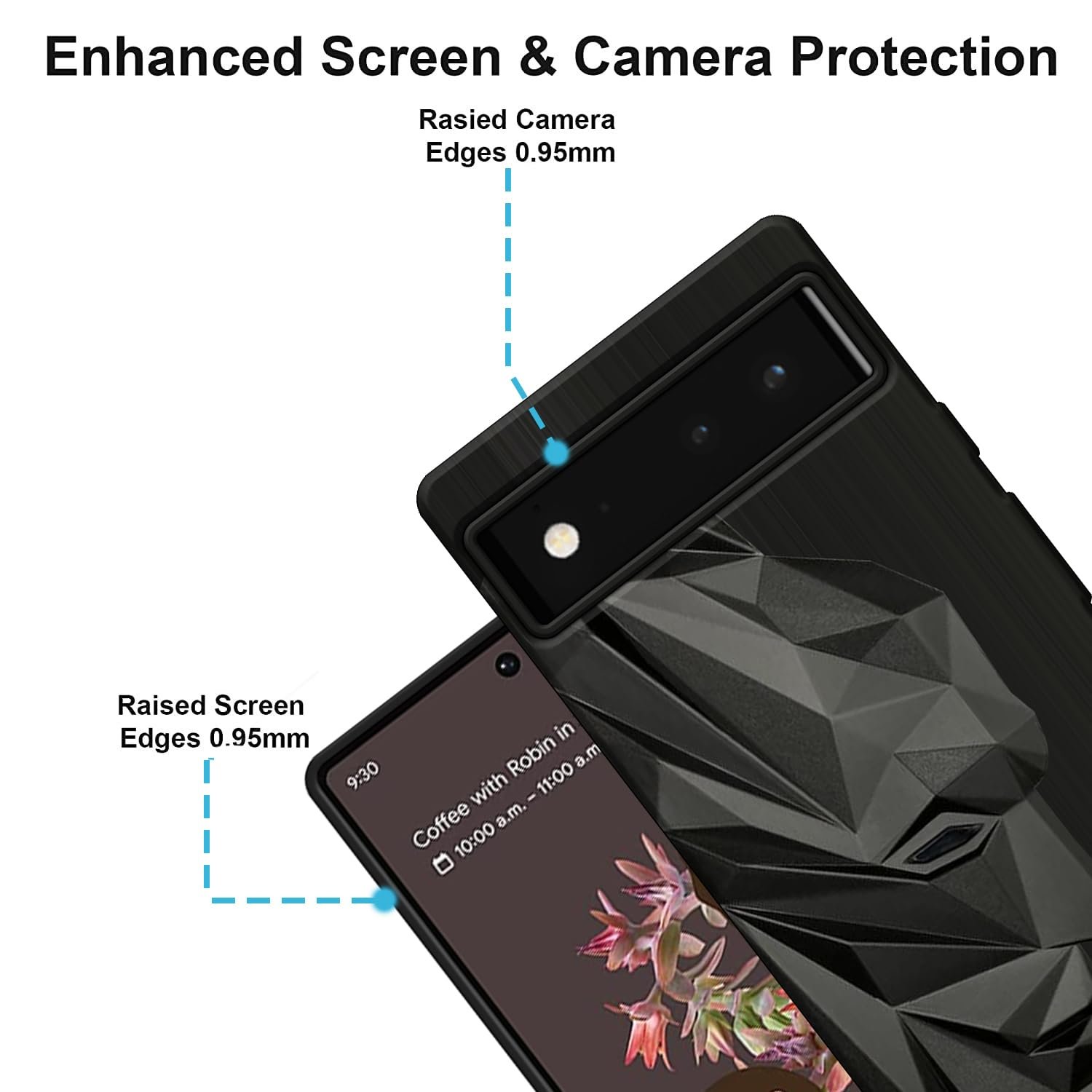 DISPLAY AND CAMERA PROTECTION | The raised camera edge and the reinforced corners protect your phone camera and display against scratches when it rests face down on surfaces.