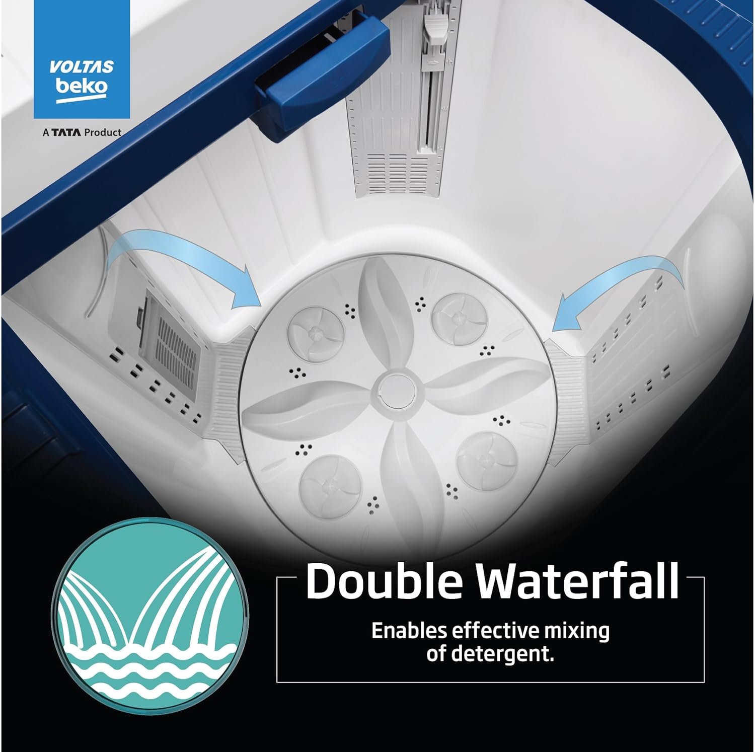 The double waterfall feature in a washing machine improves cleaning performance by enhancing water distribution. It involves two water inlets that create a cascading effect, thoroughly soaking the laundry and detergent. This ensures a more even and effective wash, particularly for large or heavily soiled loads. The double waterfall feature helps achieve cleaner clothes with less water and energy, making the washing process more efficient.