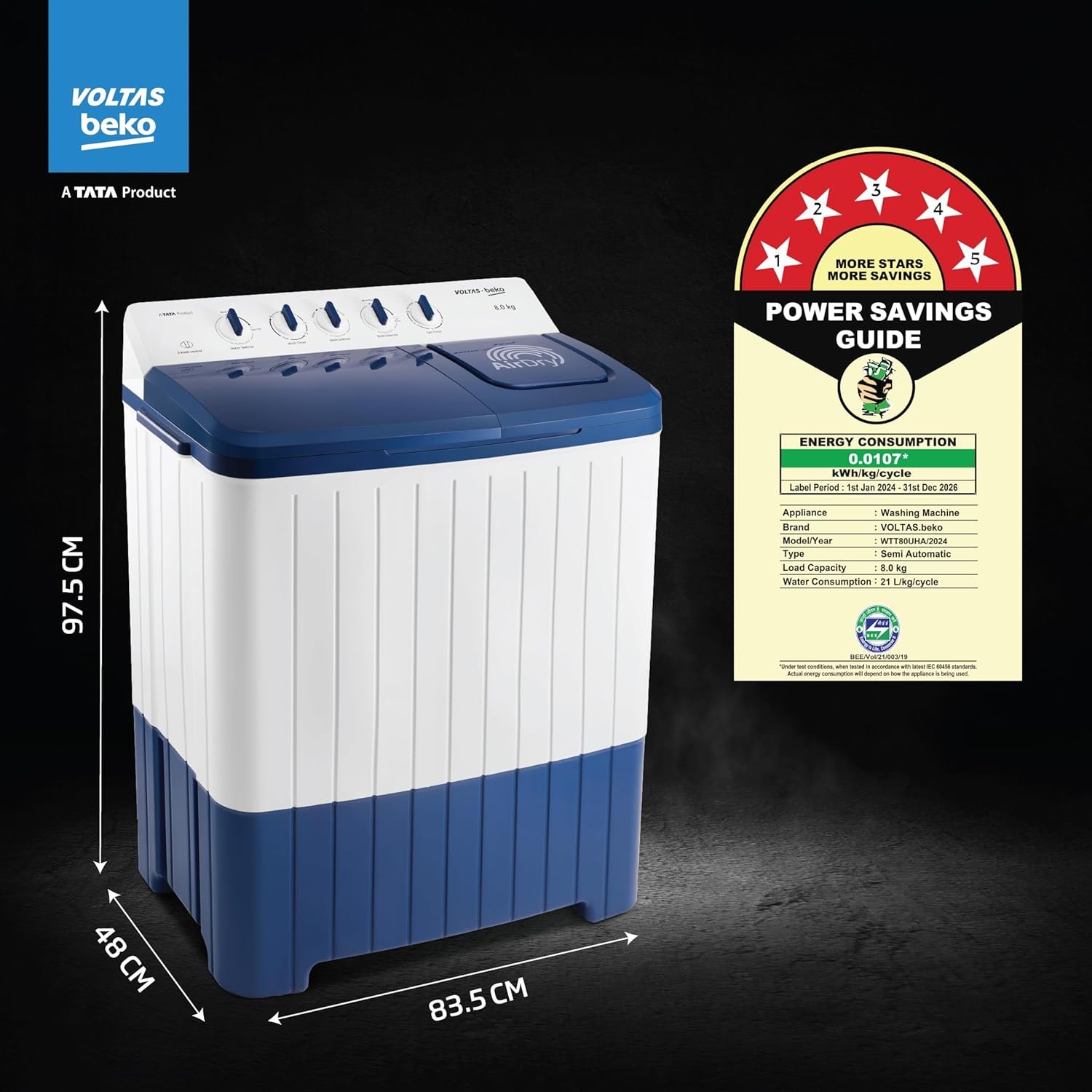 Energy Star rating: 5 Star best in class efficiency; Energy consumption – 0.0107 KWh/kg/cycle & Water Consumption: 21 L/Kg/Cycle (Please refer BEE label for more information)