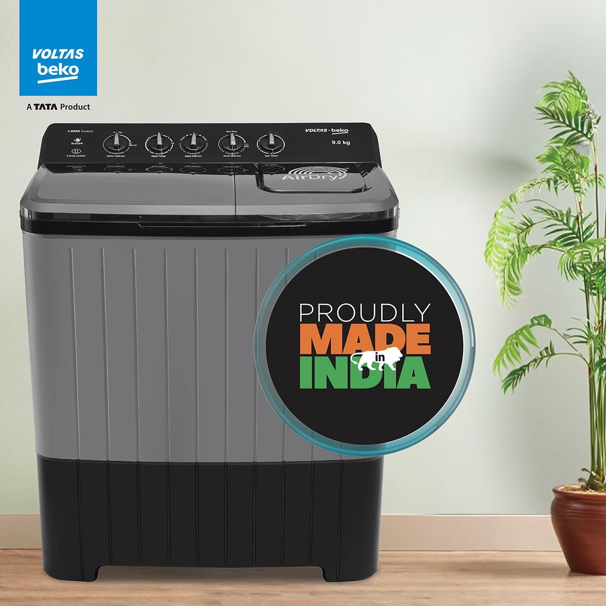 The Voltas Beko 9 kg 5-star semi-automatic twin tub washing machine features a special pulsator, double waterfall technology, and a cassette filter for efficient cleaning. Its air dry function ensures faster drying. With an eco-friendly design and dual tub system, it offers superior performance and convenience.