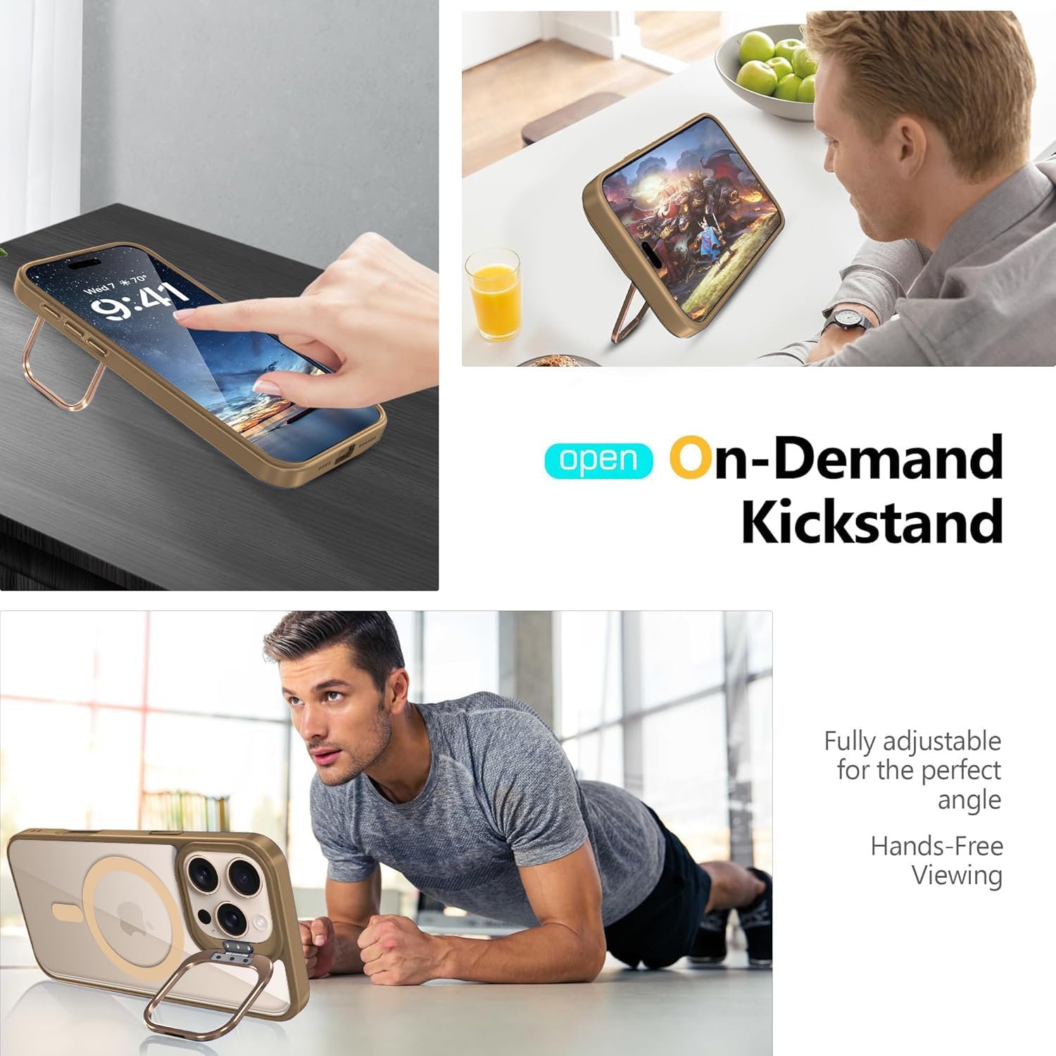 Adjustable Stash Stand: positioned around camera frame to stay hidden when folded away while keeping MagSafe ring 100% unobstructed; enjoy a freely adjustable and stable view for watching shows whenever
