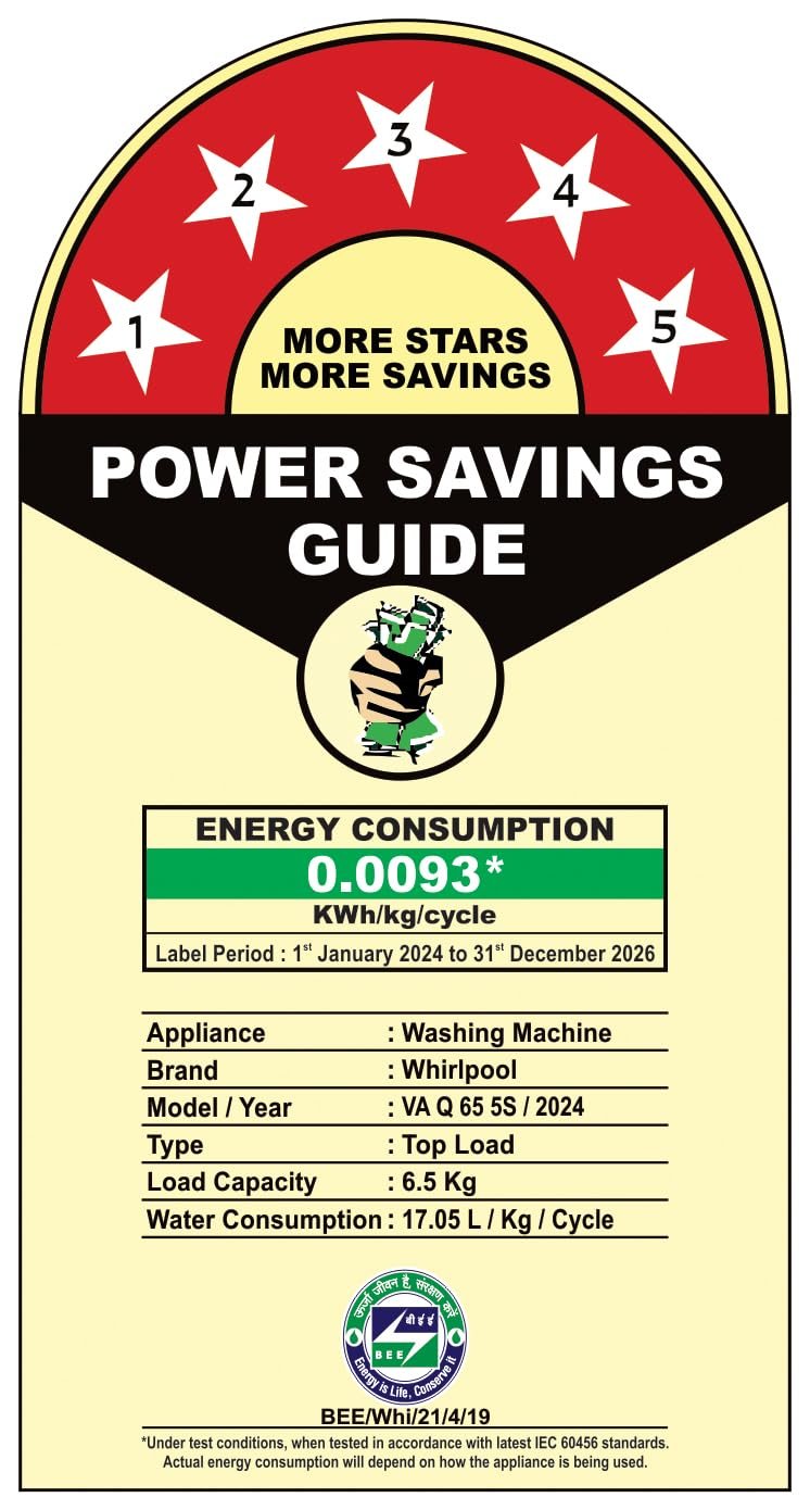Energy star rating 5 Star: Best in class efficiency, Annual energy consumption: 0.0093 KWh/kg/cycle (Please refer BEE label for more information), Model/Year : VA Q 65 5S/2024.