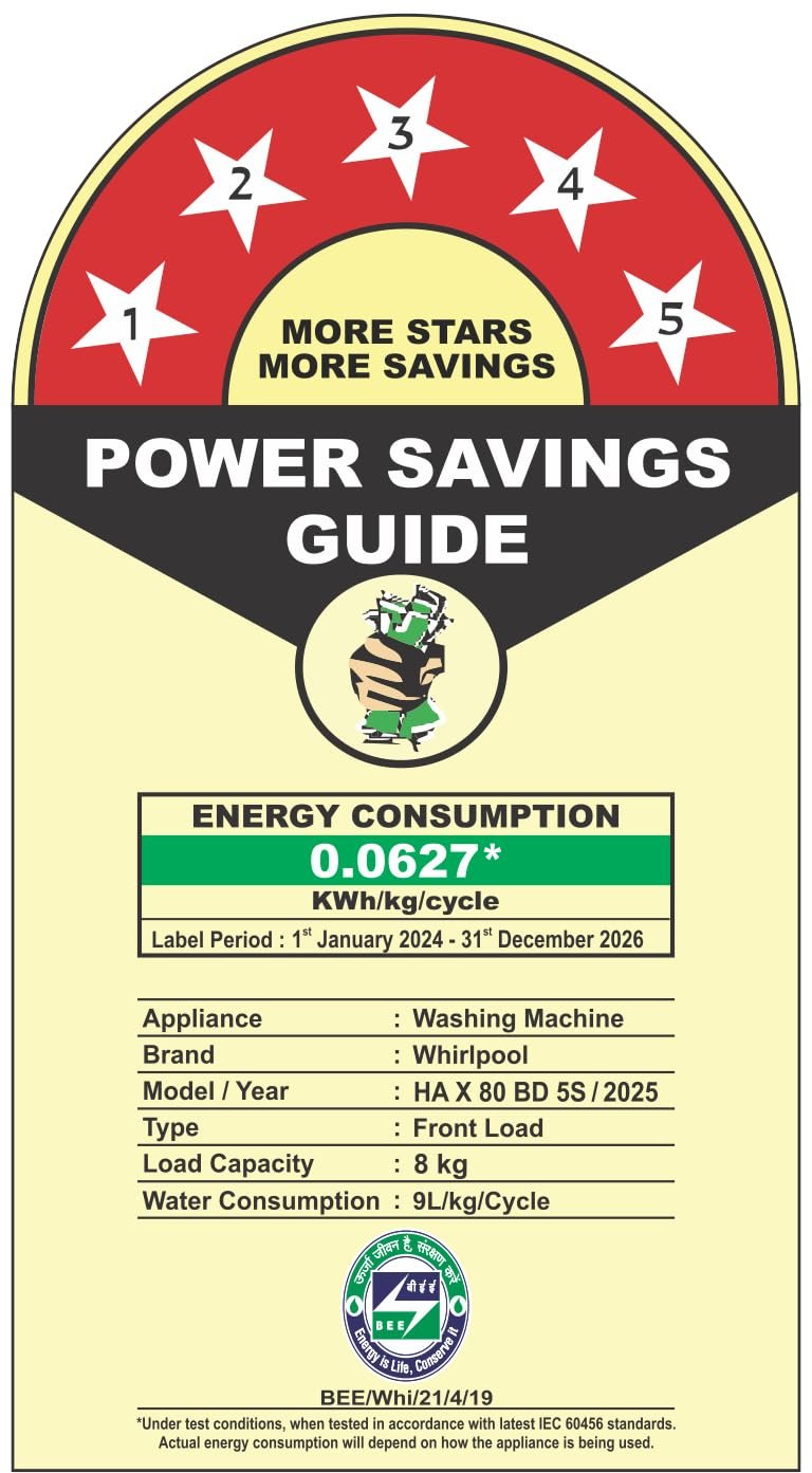 Energy Rating 5 Star: Best in class efficiency | Energy consumption – 0.0627* KWh/kg/cycle (Please refer BEE label for more information), Model/Year : HA XC 80 BD 5S/2025