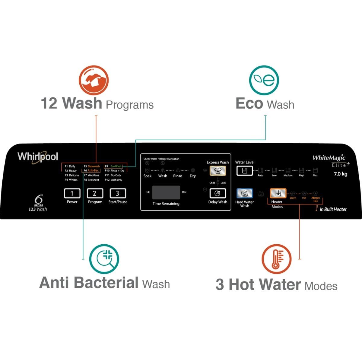 123 WASH These Machines come comes with an easy to use 3 button control panel to take care of your washing needs. All you need to press is 1-2-3 and the machine’s intelligence takes over to deliver the perfect wash. Hard Water Wash Whirlpool washing machines adapt the operations for washing in hard water by sensing the water type and adapting the wash cycle to give you up to 20%. 12 Wash Programs The 12 wash programs are designed to wash different fabric types perfectly. ZPF TECHNOLOGY To resolve water pressure situations, Whirlpool presents ZPF Technology. Zero Pressure. Fill technology ensures that the wash tub gets filled 50% faster even if the water pressure is as low as.17mpa.