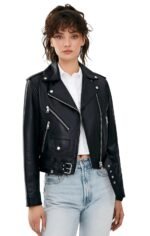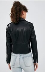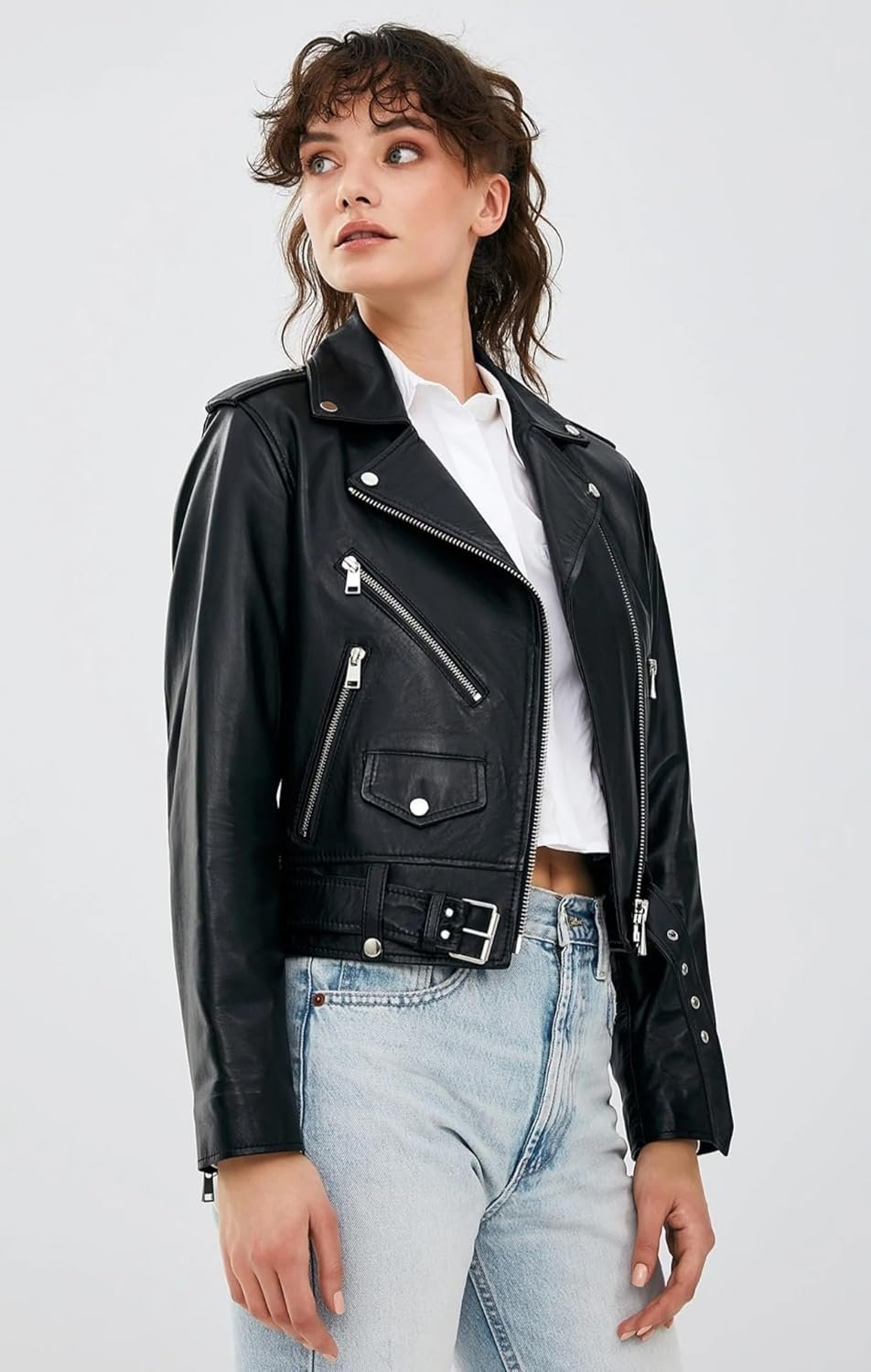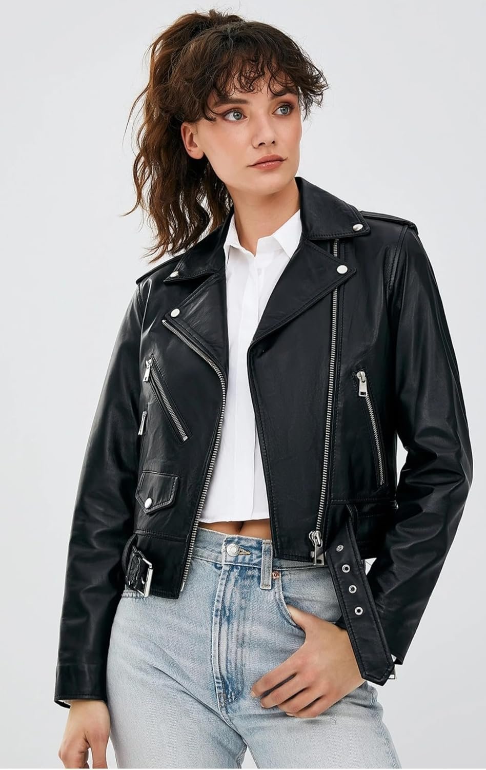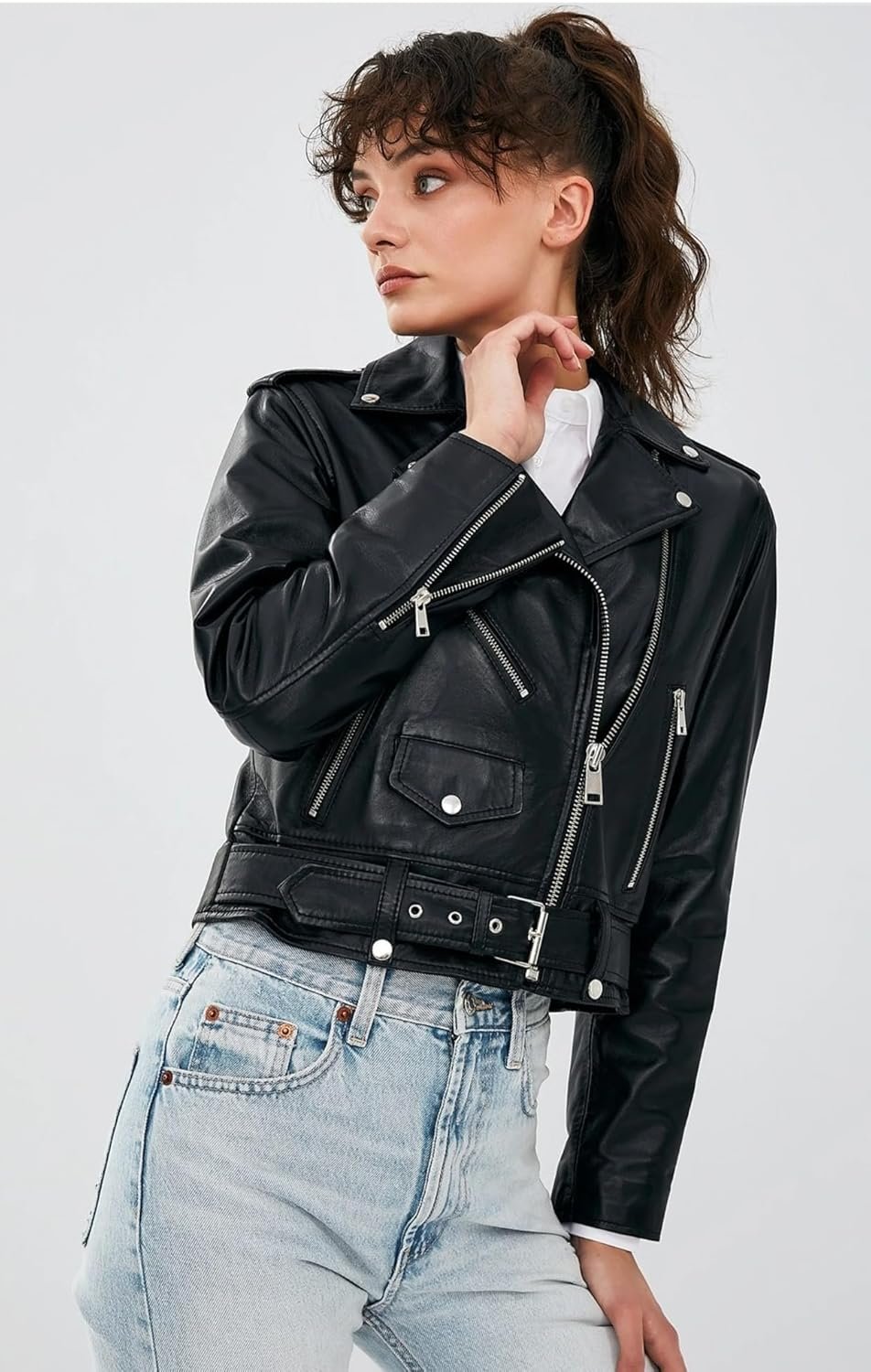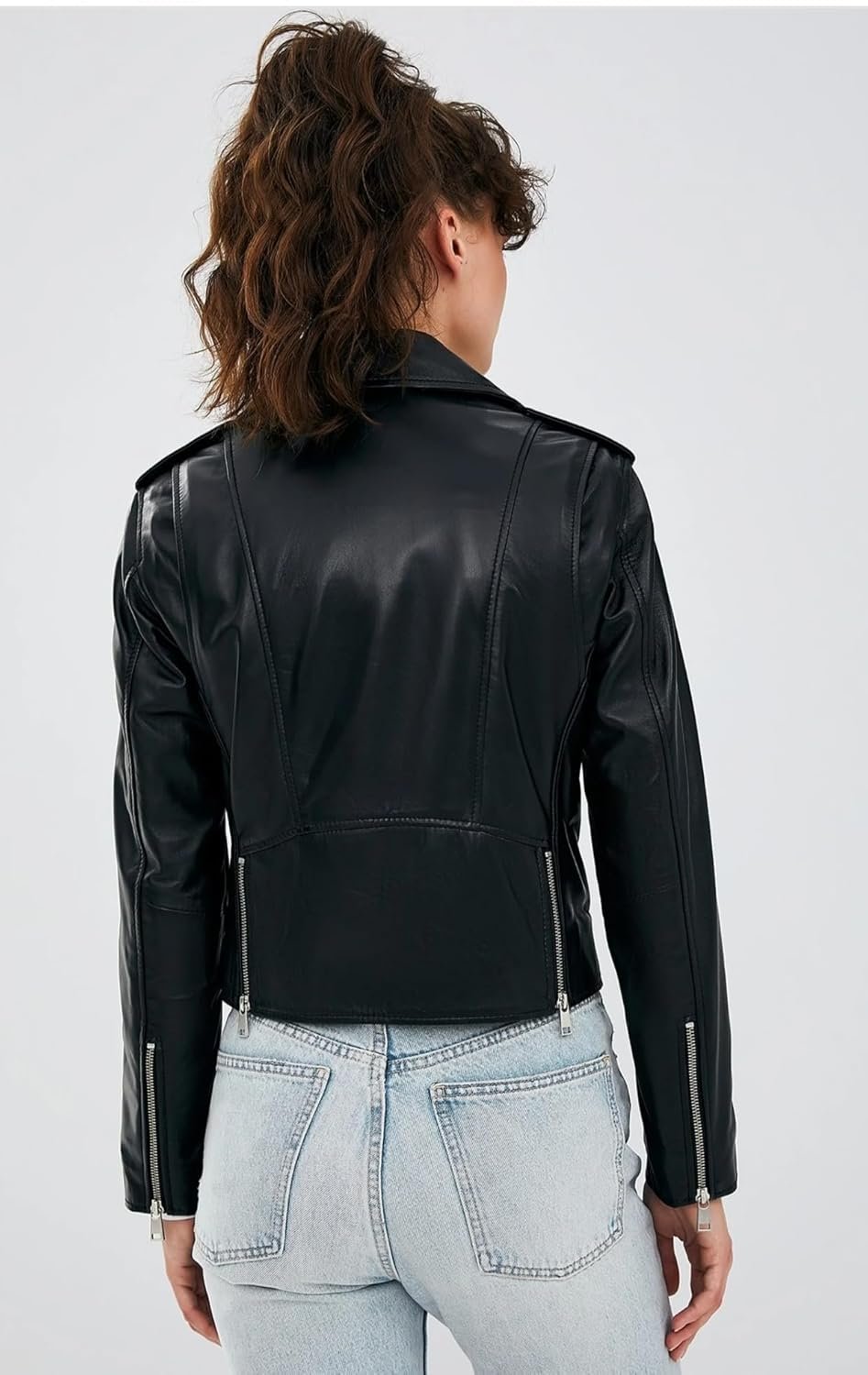 Women’s Black Leather Biker Jacket with Zippers and Pockets|Premium Women’s Leather Moto Jacket for Winter – Trendy & Warm|Perfect Winter Style Soft & Durable