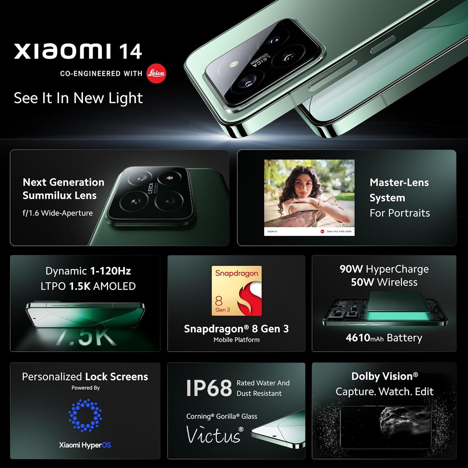Xiaomi 14 (Jade Green, 12GB RAM, 512GB Storage) | 50MP Leica Professional Optics | 120 Hz 1.5K LTPO AMOLED | SD 8 Gen 3 Hyper OS