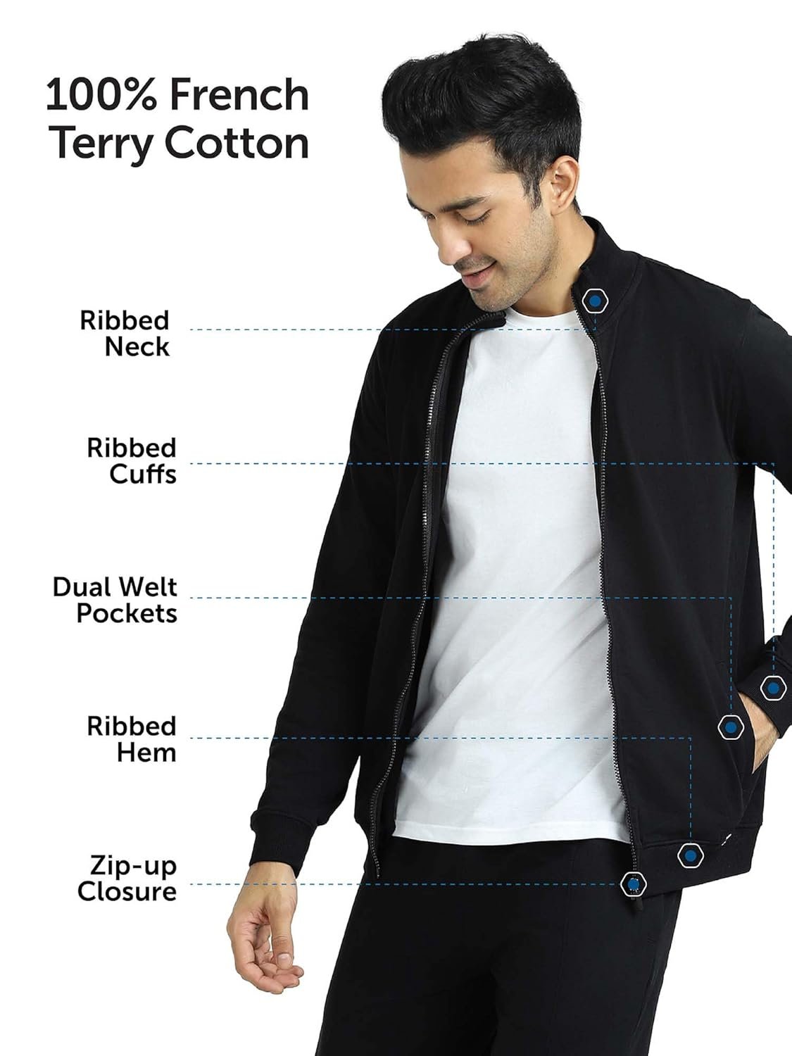 Our buttery-soft and naturally-wrinkle resistant 100% French terry cotton fabric is crafted to keep you cool in the summers and cozy in the winters. Woven with loops on the inside to absorb moisture and maintain breathability and a flat surface on the outside for a sumptuously soft feel, this functional fabric lets you do it all in comfort – from traveling to lounging and everything in between. Feel our French terry cotton get softer with every wash and wear it for years to come. Blending in comfort and functionality, our Cruze collection is crafted from 100% French terry cotton that feels buttery-soft and ultra-breathable. Enhanced with our IntelliEaze technology for a luxuriously light appeal, this capsule of moisture-absorbent separates is made for the man on the move. Whether you’re sipping on coffee at your neighbourhood cafe or moving about town, this zip-up jacket will let you do it all in effortless ease and style. Treated with a bio-wash to enhance softness with every wear, it features slash pockets to keep your essentials handy along with a full-zipper closure style for added appeal. This tag-less style comes designed with ribbed trims for a neat finish.