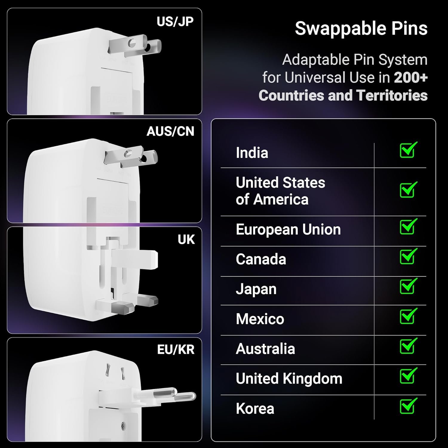 Swappable Pins: Swappable pins allow compatibility with power standards in Europe, the UK, the US, Japan, Australia, Korea, and China.