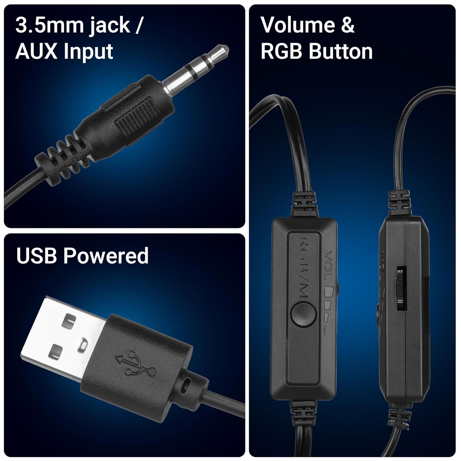 RGB LED modes: This 2.0 speaker features multiple RGB LED light modes with a control switch, adding visual flair.
