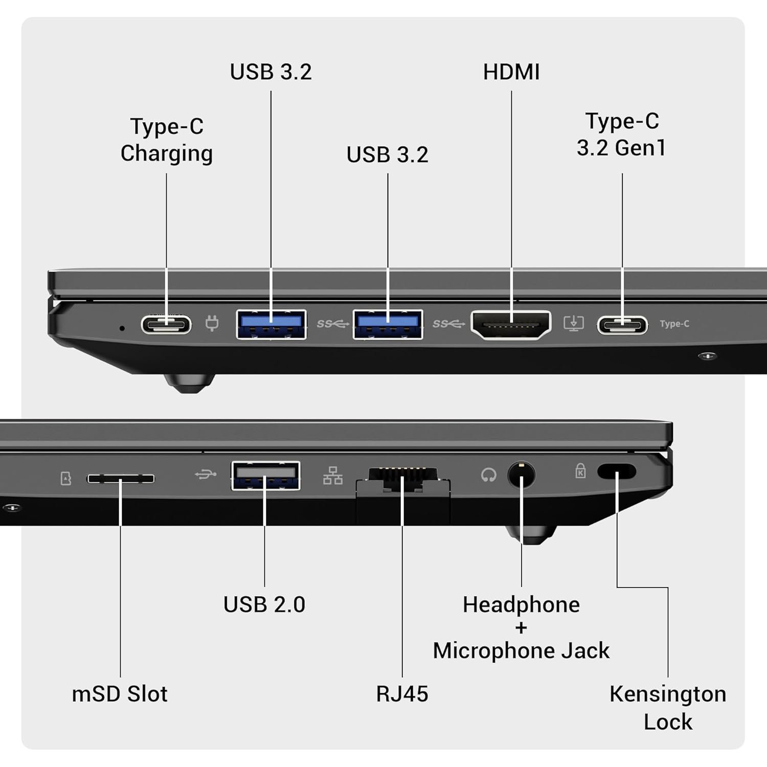 Utilize the laptop’s easy connectivity, which includes 2x USB 3.2 ports, one USB 2.0 port, RJ45, a mSD slot, a 3.5mm headphone + microphone jack, a dedicated Type-C port for charging, an additional Type-C 3.2 Gen1 port (for data and display output max. 1080p), an HDMI port for video output. Supports a Kensington lock feature as well