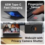 Your seamless connectivity to the laptop comes with 2x USB 3.2, 1x USB 2.0, an mSD slot, a 3.5mm headphone + mic port, 2x Type-C ports (one for charging & other Type C version 3.2 Gen 1 for super-fast data transfer) and a HDMI port for video output. The Type C port is capable of providing Display output;The laptop’s fingerprint sensor strengthens user privacy while delivering security and ease of access. The Laptop comes with a Kensington lock option. With the webcam and potent speaker combination, you can now lead or take part in meetings and make longer video chats with friends. It enables both clear audio and crystal-clear video transmission