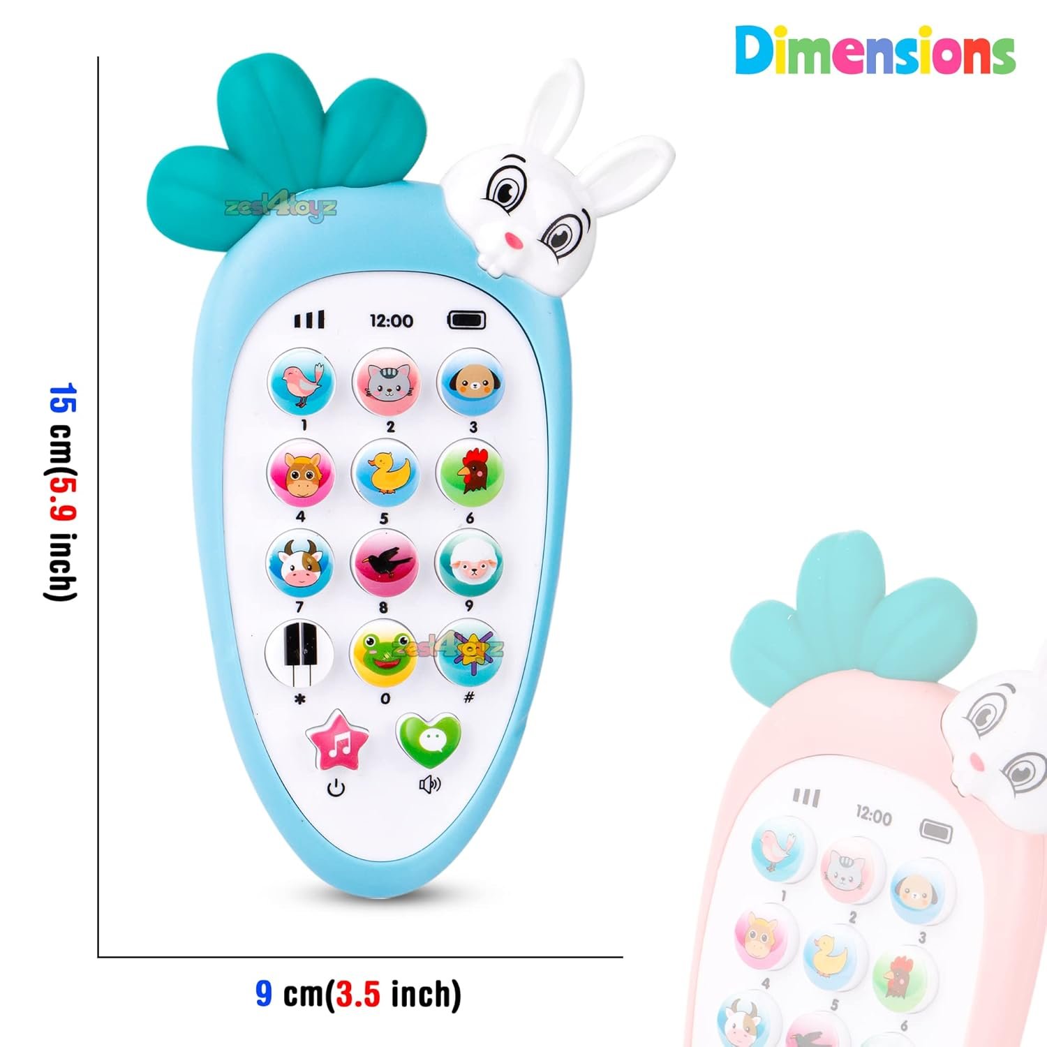 📞 Interactive Musical Toy Phone – Carrot-shaped design with bunny top and colorful cartoon buttons.